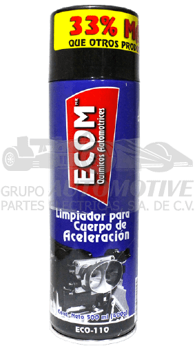 LIMPIADOR PARA CUERPO DE ACELERACION ECOM 540ML (400G). SU FORMULA EXCLUSIVA PERMITE REMOVER GOMOSIDADES, ACEITE Y POLVO QUE SE ADHIERE AL CUERPO DE ACELERACIÓN. POR SU RÁPIDA EVAPORACIÓN PUEDE USARSE EN LA LIMPIEZA DE LA VÁLVULA BYPASS, IAC, AI5 Y EN ALGUNOS SENSORES CON TERMISTOR INSTALADOS EN LOS CIRCUITOS DE ADMISION DE AIRE. SU TUBO DE EXTENSIÓN DE 30CM FACILITA SU MANEJO EN ESPACIOS REDUCIDOS PROPORCIONANDO UNA LIMPIEZA EFECTIVA EN CUALQUIER COMPONENTE DEL MOTOR.
