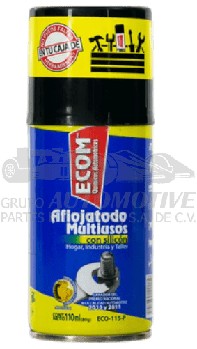 AFLOJATODO MULTIUSOS CON SILICON ECOM 110ML(80G). PENETRA FÁCILMENTE EN LA UNIÓN DE LOS METALES LIBERANDO SU ADHERENCIA POR ÓXIDO Y POLVO. ELIMINA RECHINIDOS EN ARTICULACIONES MECÁNICAS. FORMA UNA CAPA REPELENTE QUE DESPLAZA LA HUMEDAD EVITANDO LA FORMACIÓN DE ÓXIDO. LUBRICA CHICOTES Y MECANISMOS DEL AUTOMÓVIL. ÚTIL EN CHAPAS Y EN MÚLTIPLES APLICACIONES DONDE REQUIERA LUBRICIDAD. SU TUBO DE EXTENSIÓN FACILITA SU APLICACIÓN EN ESPACIOS DE DIFÍCIL ACCESO.